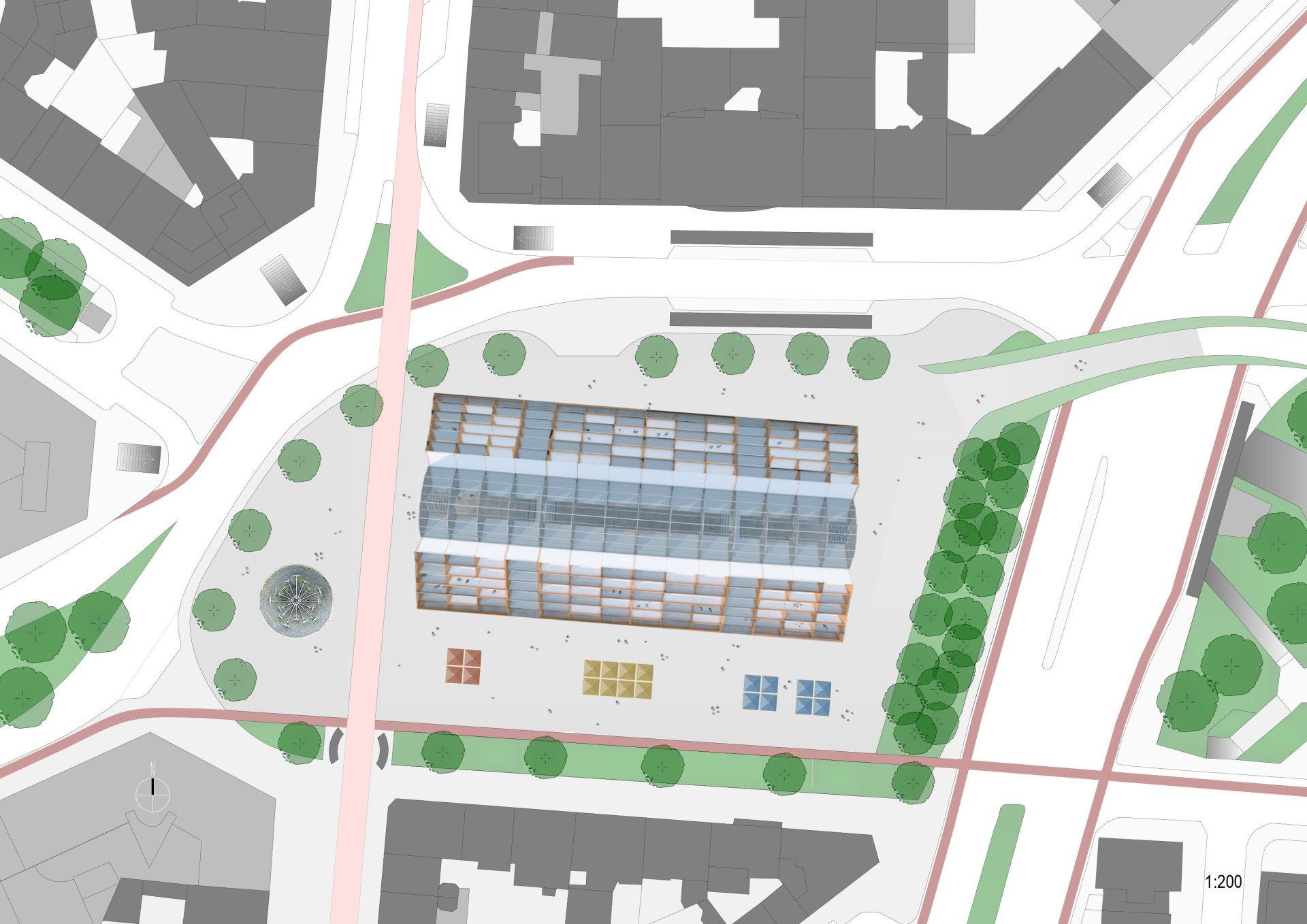 Wir schlagen deshalb einen markanten Hybrid vor, der aus einer spektakulären Markthalle besteht, die von einer 6-geschossigen Mantelbebauung eingerahmt wird.